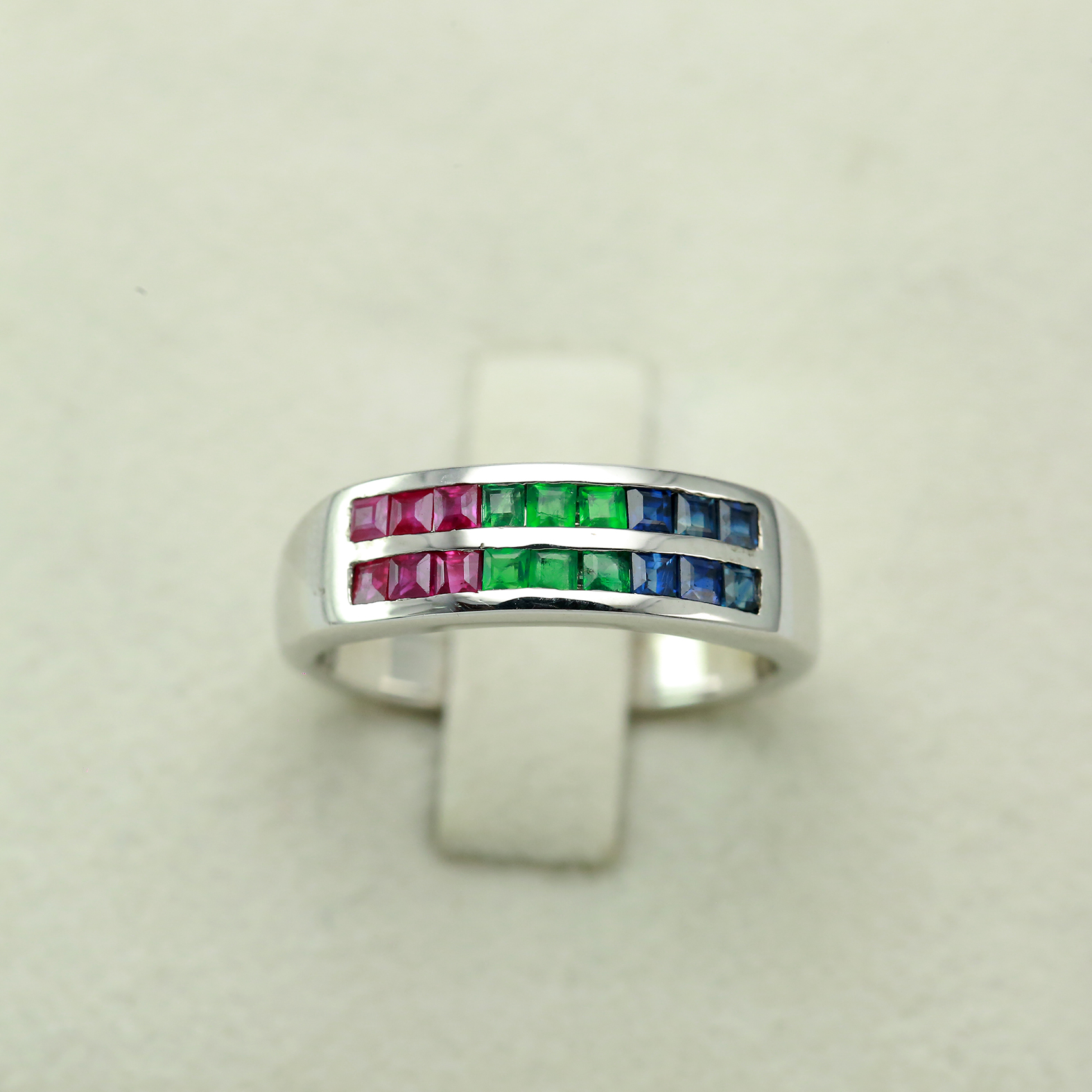 Silver Ring Set with Natural Blue Sapphires, Rubies and Emeralds